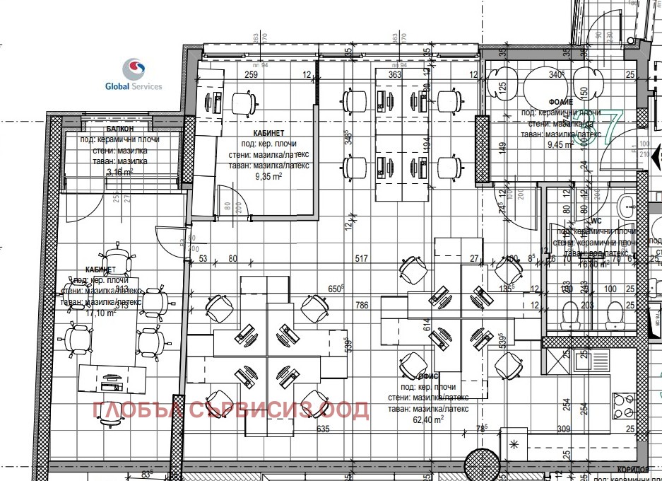 Разпределение: фоайе, голямо отворено пространство, два кабинета, балкон, санитарни помещения.