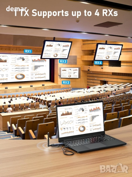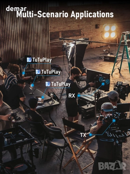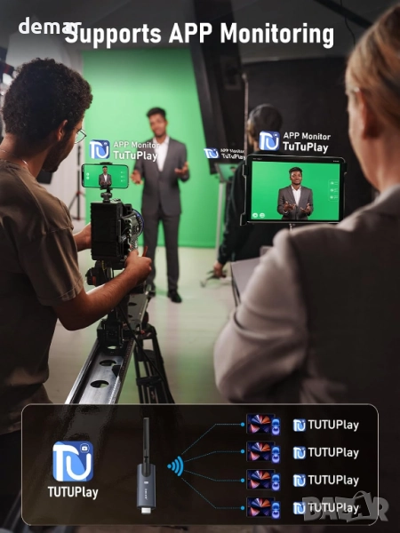 Безжичната HDMI система Lemorele R1000 предлага лесна plug-and-play настройка без нужда от софтуер, предоставяйки 1080P HD визуализация и ултраниска латентност от 50ms чрез 5GHz технология за плавно стриймване в реално време. Тя осигурява впечатляващ обхват от 200 метра, използвайки антена с висок коефициент на усилване, поддържайки стабилна връзка дори в големи пространства. Поддържайки до четири приемника едновременно и интегрирайки се с приложението TuTuPlay, тя позволява на множество устройства или мобилни екрани лесно да споделят съдържание. Надеждното захранване 5V2A осигурява непрекъсната работа, а оптималното разположение без препятствия увеличава максимално силата и производителността на сигнала.