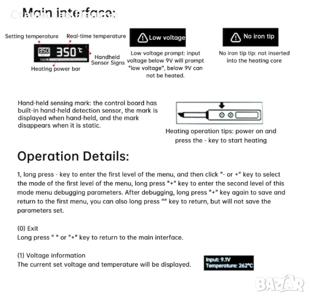 1. Работната температура на поялника може да достигне 80~450℃, не докосвайте главата на поялника!