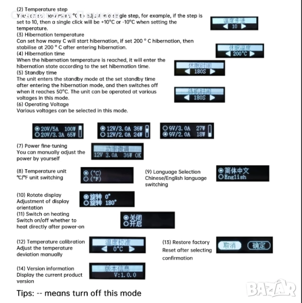 6. Могат да се зададат различни параметри като температура на покой, време на готовност, работно напрежение, поддръжка на китайски и английски език, преобразуване между Целзий (80~450℃) и Фаренхайт (176-842℉) и др., за да се отговорят на персонализираните нужди.