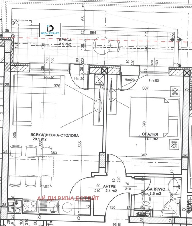 Разпределение: антре, дневна с кухненски бокс, спалня, баня с тоалетна и уникална тераса с излаз от дневната и спалнята.