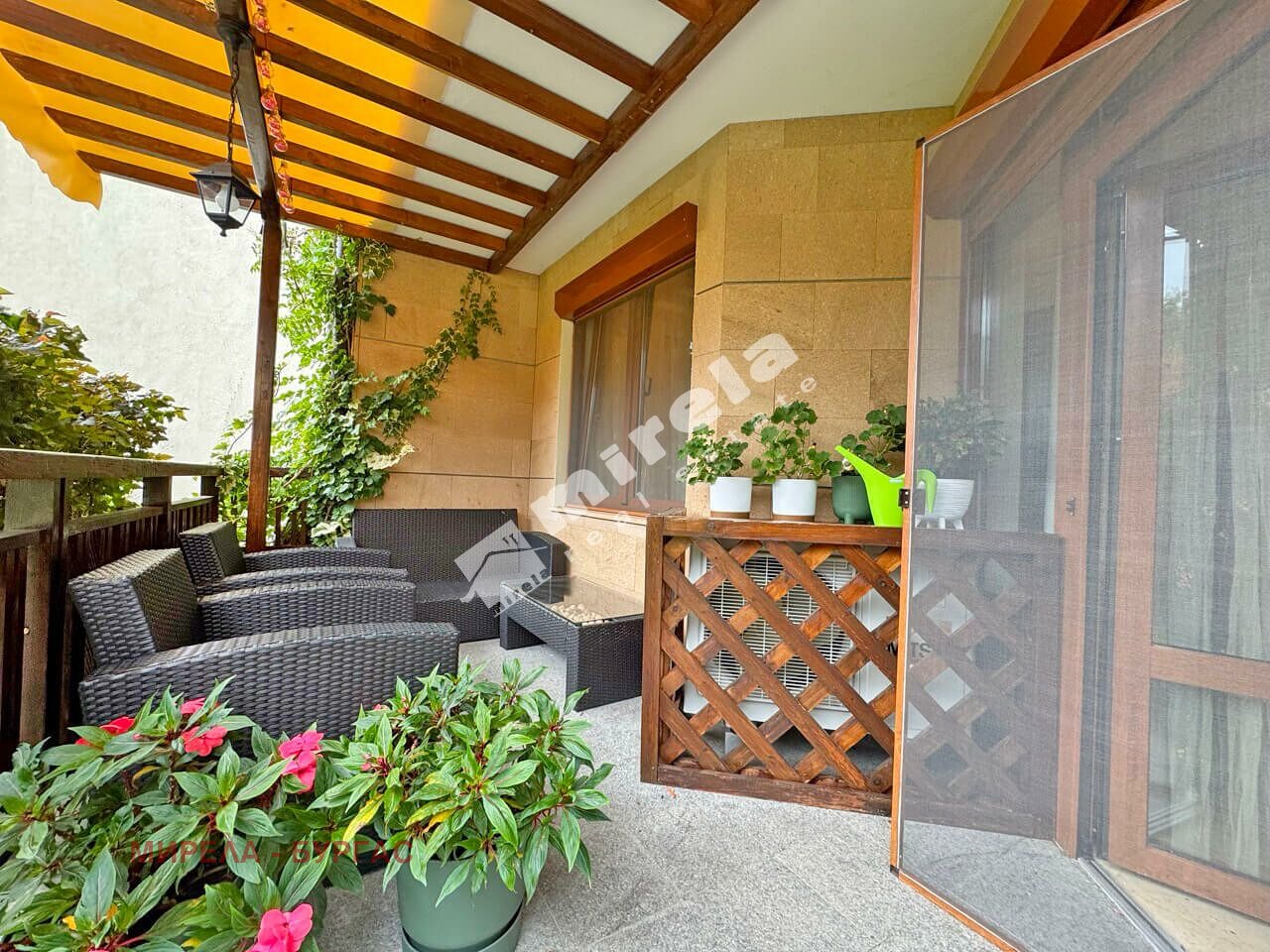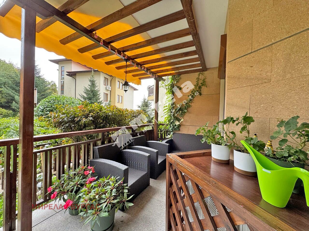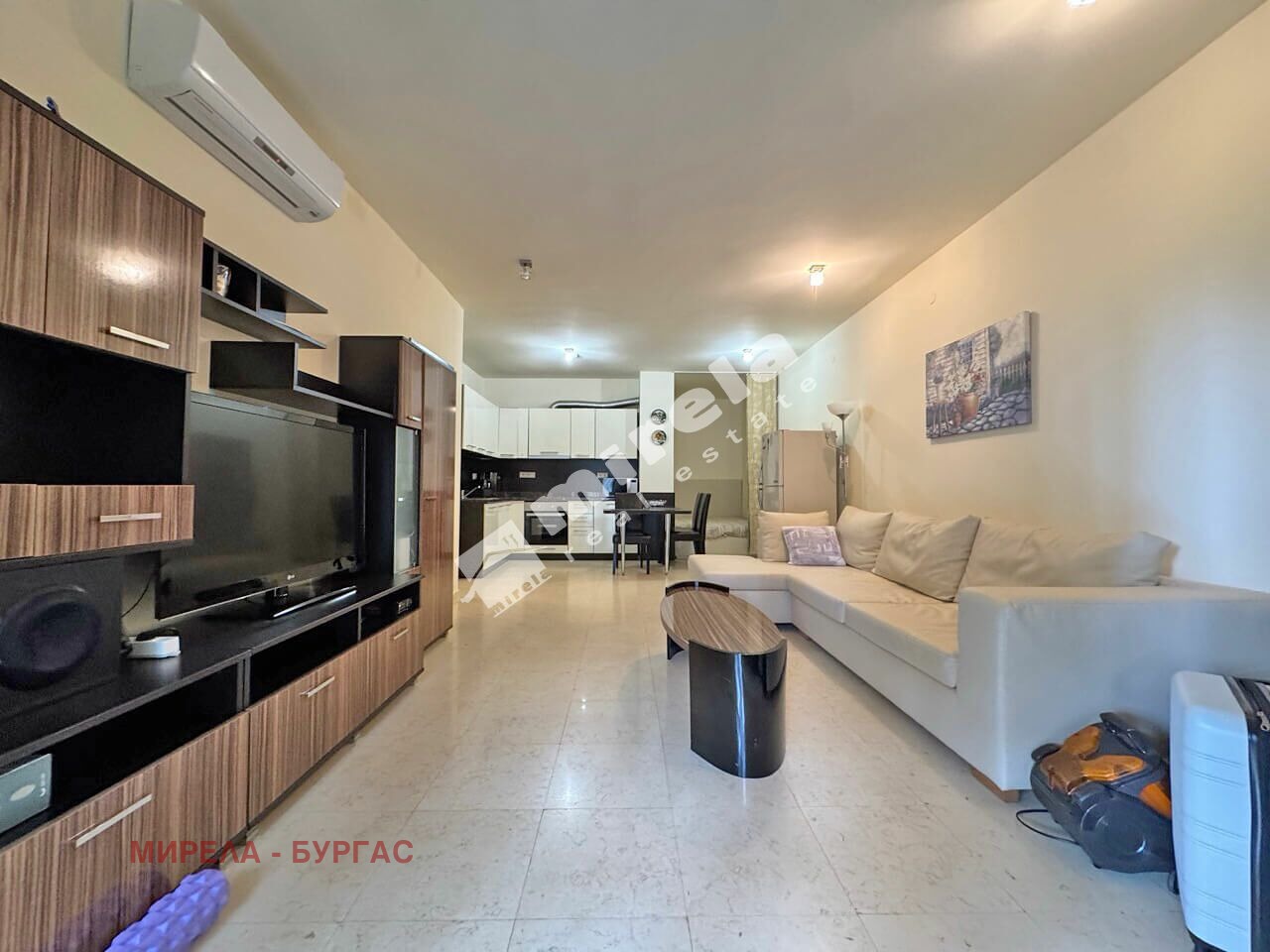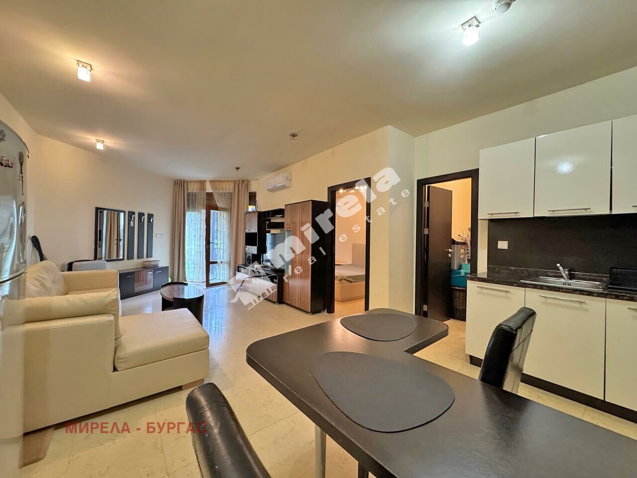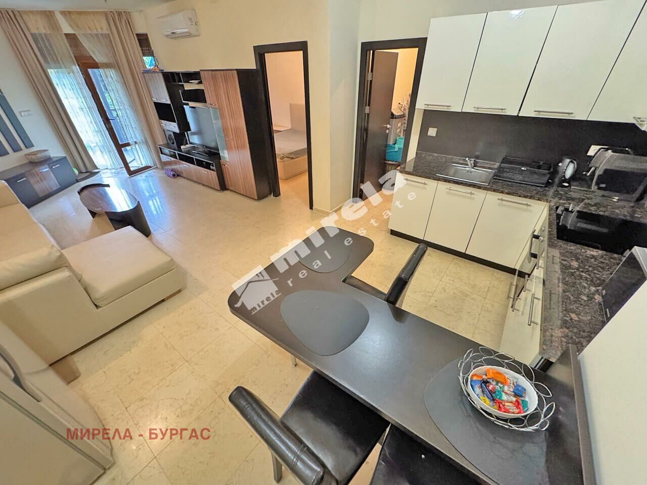 Апартаментът е разположен на партерен етаж, с площ от 83 кв.м., с разпределение: просторна всекидневна с кухненски бокс, с обособен кът за спане, една самостоятелна спалня, мокро помещение, баня със санитарен възел и веранда.