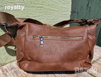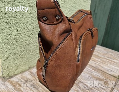 Дамска чанта от много мека кафява кожа в преливащи се по-светли и тъмни нюанси. Две големи отделения в средата закопчаващи се с много лесно подвижни метални ципове. На лицевата част на чантата имате едно средно по големине отделение закопчаващо се с цип и метална емблема на него. На гърба имате джобче с цип. Декоративни ципове на двете странични ципове на чантата. Кафява текстилна дръжка с регулираща се дължина.
