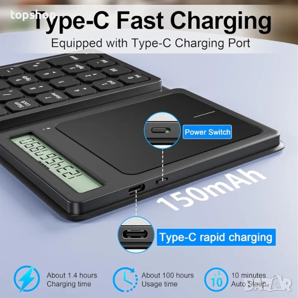 Дизайн за зареждане/енергоспестяване с Type-C: Оборудван с порт за зареждане Type-C, който поддържа поставяне напред и назад. Може да се използва непрекъснато в продължение на 75 часа, ако се използват само калкулаторът или клавишите, или може да се използва непрекъснато в продължение на 13 часа, ако се използва само тъчпадът след пълно зареждане, и автоматично влиза в интелигентен режим за пестене на енергия, когато не се използва (без операция в продължение на 10 минути).