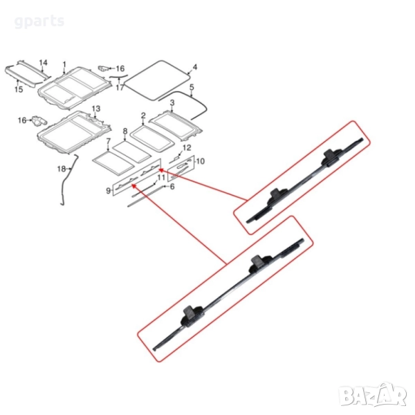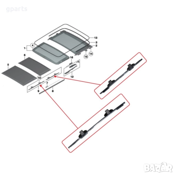 водачи, щора, панорамен таван, BMW, X1, E84, OEM, 54102993888, GParts, магазин София, авточасти, релси, механизъм за щора