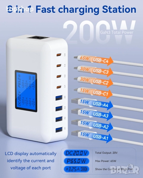 Ново Rsydmny 200W зарядно устройство - 8-портово USB C захранване, USB зарядна станция с LCD екран..