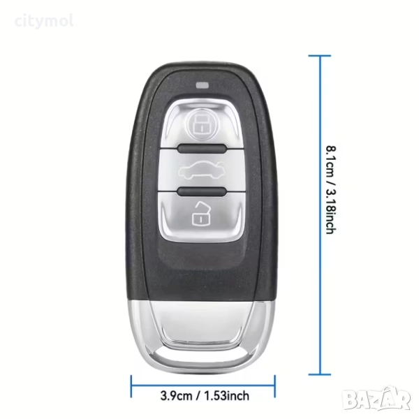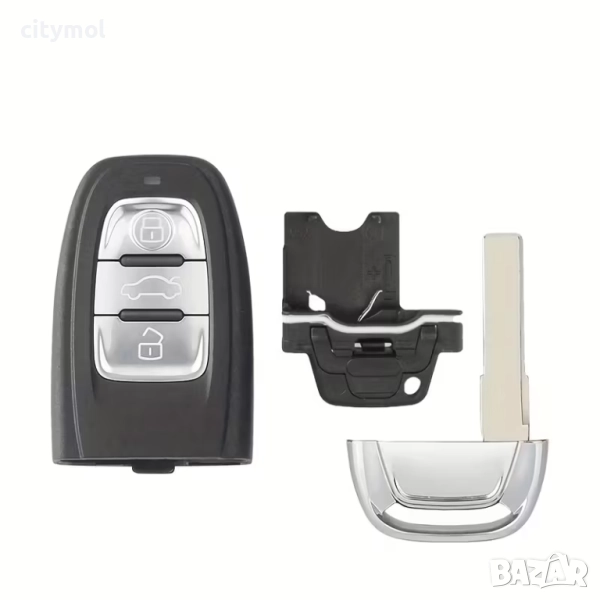 Кутийка за смарт ключ с 3 бутона за AUDI с 3 бутона за контрол на дистанционните функции + държач за батерия + ненарязан авариен ключ с профил на перото HU66. Без транспондер (чип) и електроника за дистанционното.