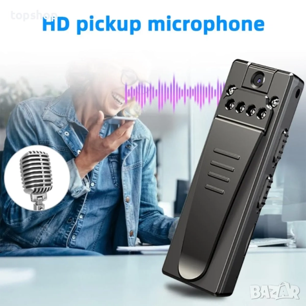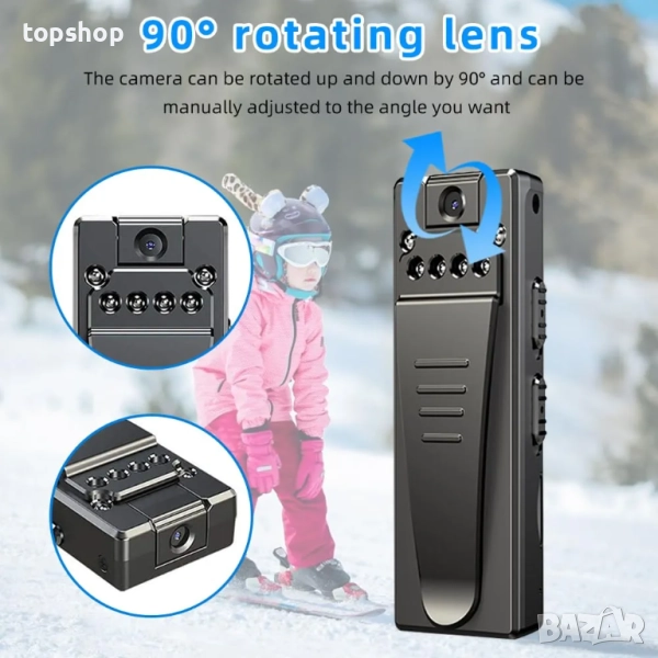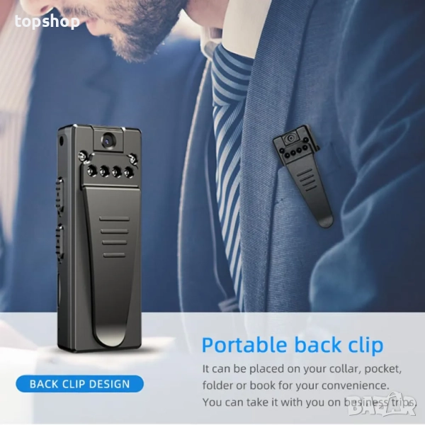 Преносима камера, носена на тялото: Дизайнът с щипка ви позволява лесно да прикрепите камерата към дрехи, чанти или други аксесоари, което ви дава свободата да записвате без ръце. Компактният ѝ размер я прави лека и лесна за носене, което я прави идеална за запис в движение.