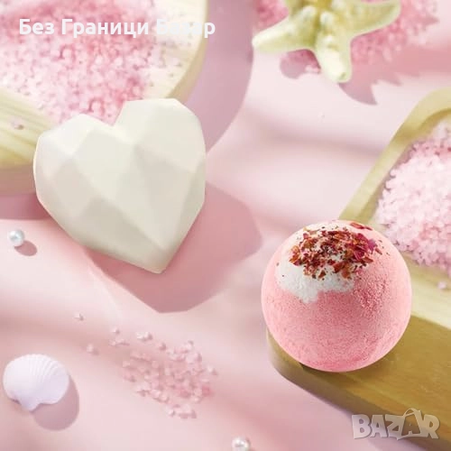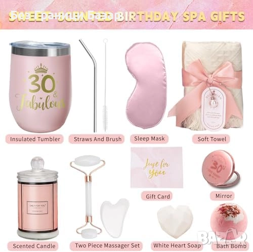 Включва термо чаша от неръждаема стомана, ароматна свещ, сапун във форма на сърце, хавлия, душ топка, маска за очи и поздравителна картичка