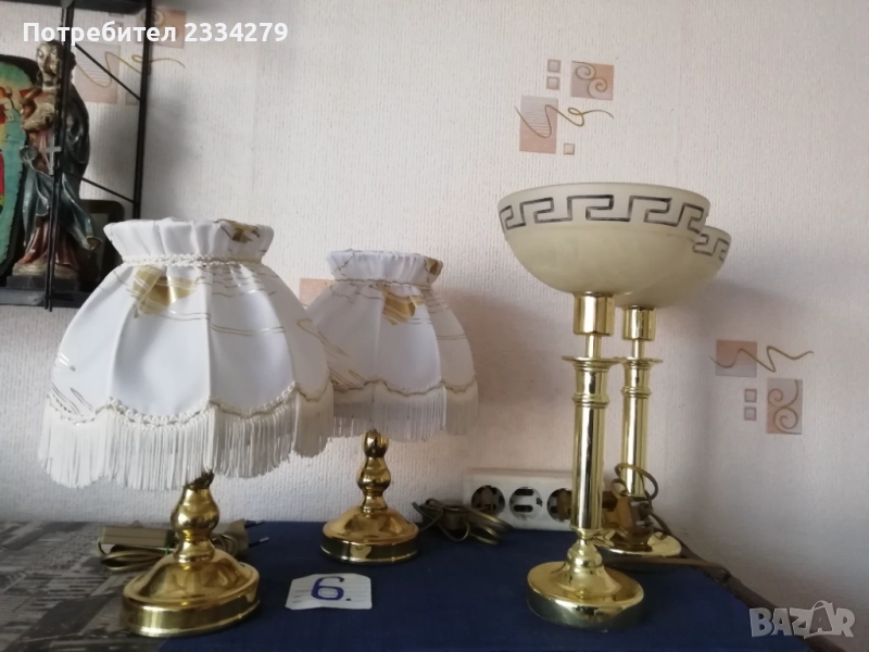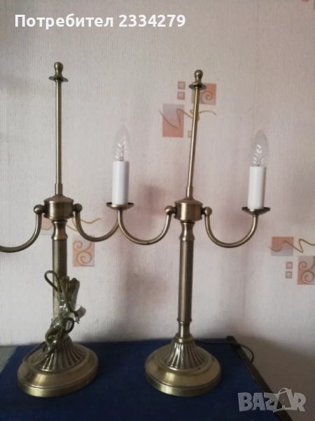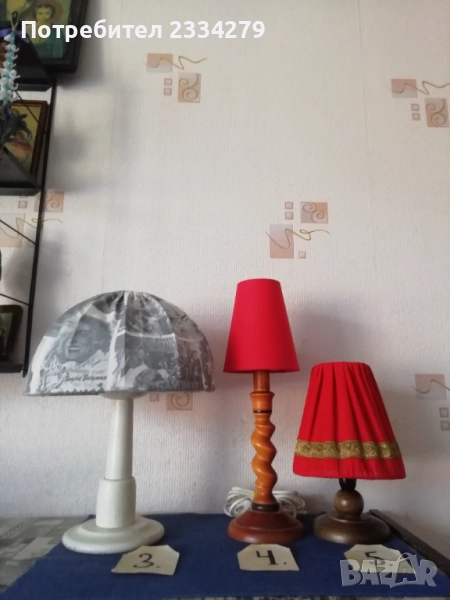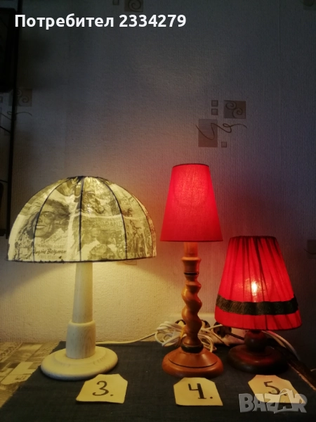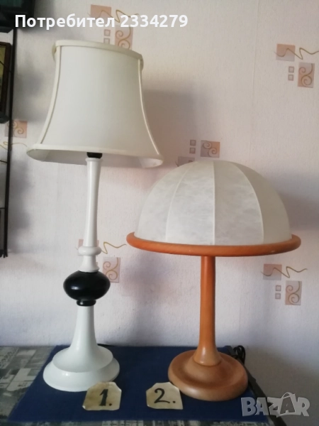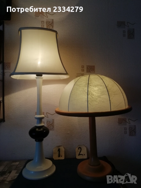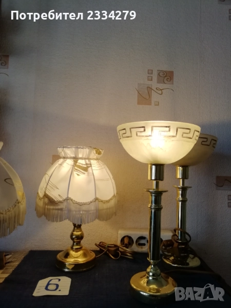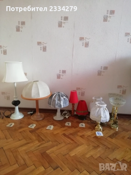 нощни лампи от различни държави и различни години. N:1 изработена от дърво, метал и купол от плат, размери 73х31см., цена 17€.; N:2 изработен от дърво и купол от кожа, размери 50х40см., цена 18€.; N:3 изработена от дърво с купол от плат имитация на вестник, размери 38х27см., цена 15€.; N:4 осукано дърво, купол червен плат, размер 39х12см., цена 8€.; N:5 дървено тяло червен купол от плат, размери 25х16см.; N:6 чифт от две лампи метал, купол от плат, размери 30х27см., цена 20€. двете; N:7 изработена от метал, стъкло, 2 броя чифт с цена.; N: без номер от снимките, 2 броя големи всеки с две гнезда, месингови тип свещник, размери 57х27см., цена 26€. двете.