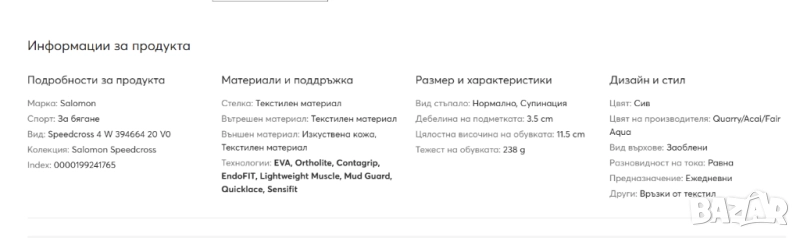 Използването на специална платформа SalomonCushioningSystem в подметката осигурява на потребителите динамично въздействие върху крака по време на движение и контролира взаимодействието с крака при огъване на подметката, предпазвайки глезена от изкълчване. Полиуретанова EVA междинна подметкав метатарзалната зона, омекотяваща и амортизираща ударите при движение по различни терени, позволява на крака да се движи естествено и да усеща земята. Формованият чрез компресия EVA материал е лек, гъвкав и има добри амортизиращи свойства, омесва се и се оформя по формата на крака на потребителя.Цялата подметка е защитена от висококачествен слой противоплъзгаща, устойчива на абразия гума с характерна шарка на протектора във формата на обърнато "V" с отлични самопочистващи свойства, осигуряващи добро забавяне при бягане по стръмен наклон .Горната част е мека, покрива добре крака (с т.нар. получорап), издръжлива, изработена от специален текстилен многослоен синтетичен материал с мрежеста структура, която не абсорбира вода и ефективно пропуска въздуха.