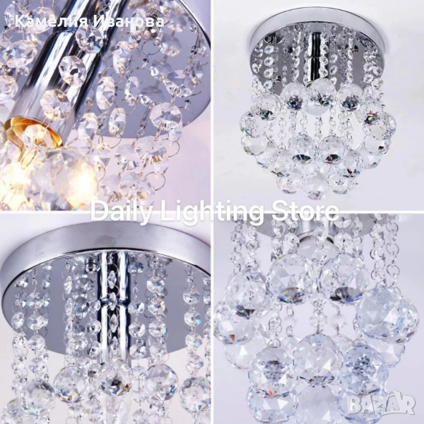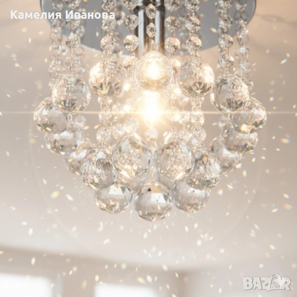 Тип: таванен полилей/плафон (semi-flush); Материал: висококачествен кристал + метална основа сребриста; Осветител: фасунга E27, съвместима с LED и енергоспестяващи крушки; Размер: компактен, подходящ за антре, спалня, хол, коридор; Монтаж: лесен таванен монтаж; Поддръжка: бързо почистване с мека кърпа; Гаранция: 12 месеца.