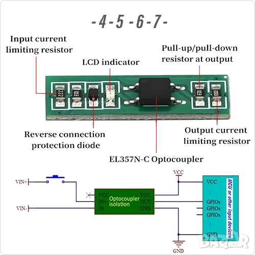 5.EL357N isolator module output 5V - 2.50 лв /Input Voltage 5V,Non-inverting Positive Logic,Signal frecuency up to 2KHz,PCB size : 26mm x 8mm