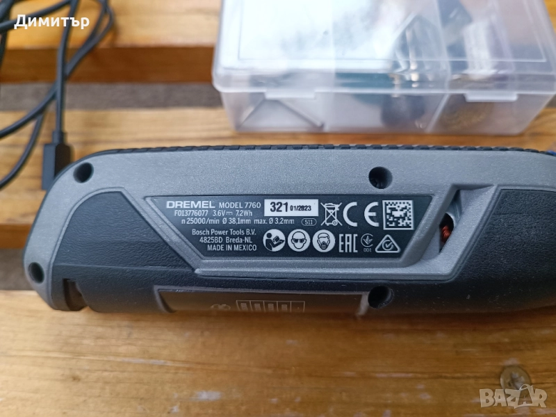 Шлайф Dremel в отлично състояние, идентично на ново. Работи без забележки. Доставя се с кабел за зареждане и кутия с накрайници. Модела е с вградена 3.6V батерия и се зарежда през USB порт.