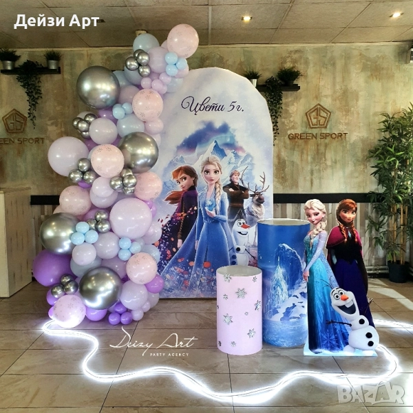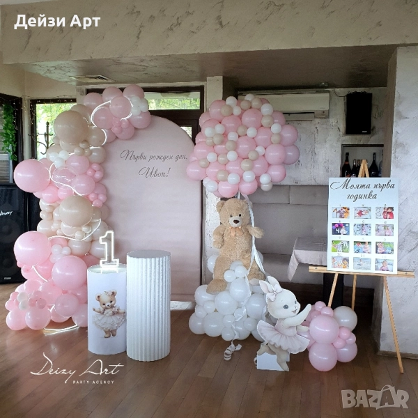 Темата на украсата избирате вие,цветове на балоните и персонален надпис също са по ваш избор.Разполагаме с голям избор на модели арки и винили,както и на различни модели масички подходящи за вашата украса.В декора могат да се включат фигури на анимационни герои ,плюшени играчки,декоративни цветя и всякакъв тип декораций подходящи за дадената тема.