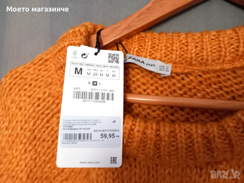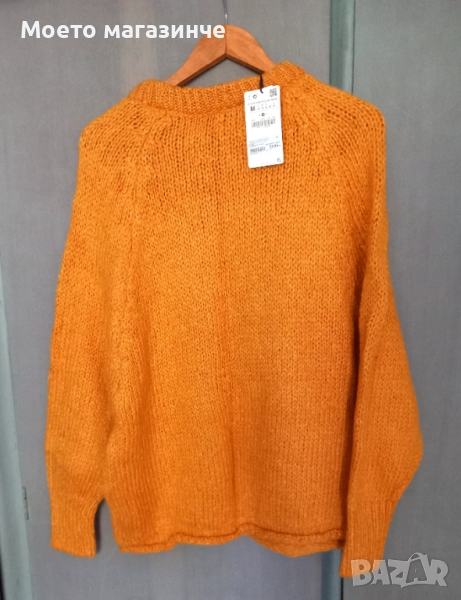 Мек и топъл пуловер ZARA в красив горчично оранжев цвят. Стои свободно и уютно, с леко падащи ръкави и пухкава прежда с мохеров ефект. Подходящ за есен и зима. Нов, с оригинален етикет.