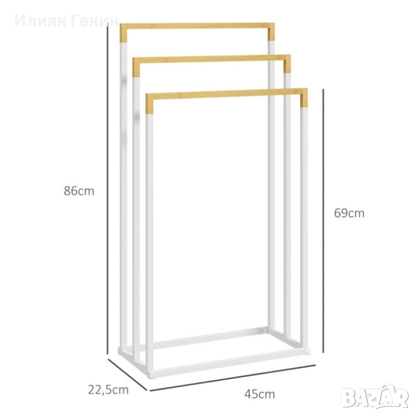 Спецификации на продукта за закачалка за кърпи: Общи размери: 45Д x 22,5Ш x 86В см; Препоръчителна товароносимост: 2 кг; За самостоятелен монтаж