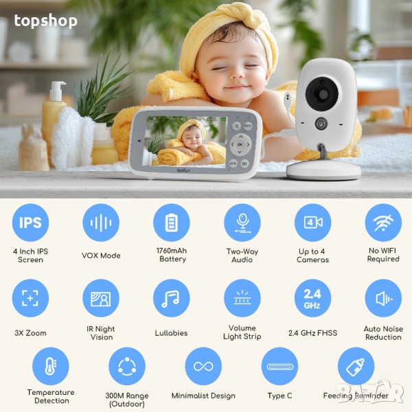 [720P и 4-инчов IPS екран] Бебефонът Boifun с резолюция 720P е с IPS екран с висока разделителна способност от ново поколение, подобряващ възпроизвеждането на цветовете и яснотата. Това ви позволява да виждате бебето си с изключителен цвят и контраст от всеки ъгъл. Освен това, IPS екранът е проектиран да издържи дълго време.