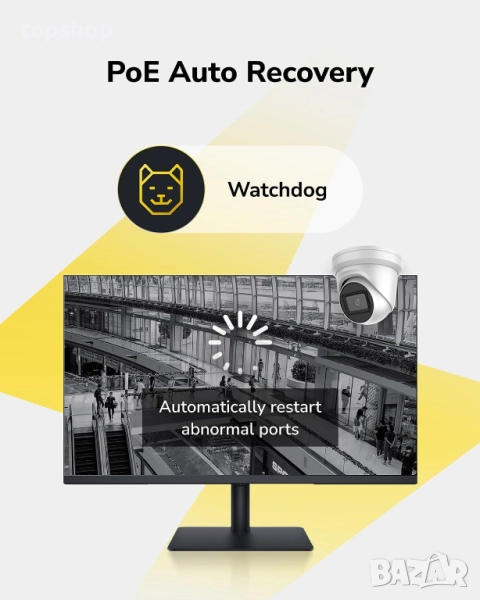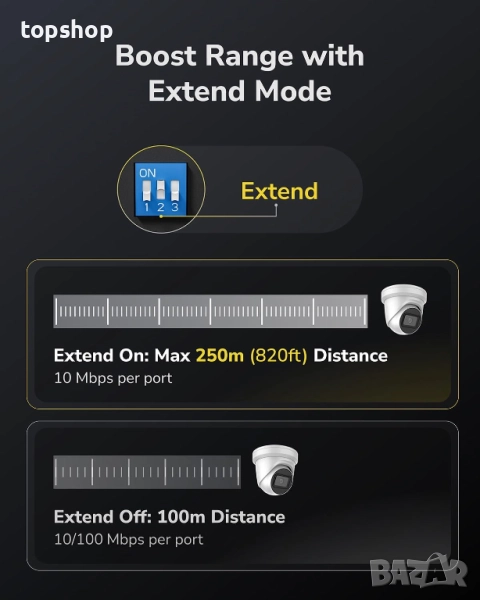 Функцията за видеонаблюдение поддържа дистанционно захранване и подаване на данни на разстояние до 250 м, което улеснява разширяването на мрежата чрез ethernet кабел до място без захранване, но нуждаещо се от фиксирано устройство, като например IP камери.