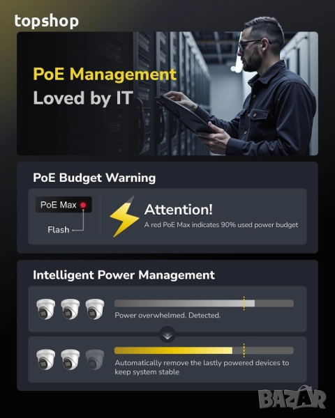 PD Detect и приоритизиране на захранването на портове: Технологията PD Detect Auto-sensing осигурява до 32W на 802.3at PoE+ устройство с обратна съвместимост за 802.3af PoE (15.4W) устройства. Технологията за приоритизиране на захранването на портове гарантира непрекъснато захранване на ключови възли. Разпределение на пиновете: алтернативно 1/2 (+), 3/6 (-).