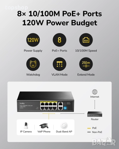 Надежден 10/100Mbps IEEE 802.3af/802.3at съвместим PoE+ комутатор с общо PoE захранване от 120W. Идеален за малки инсталации от 8 PoE устройства (IP телефон, кабелна камера за наблюдение, безжична точка за достъп).