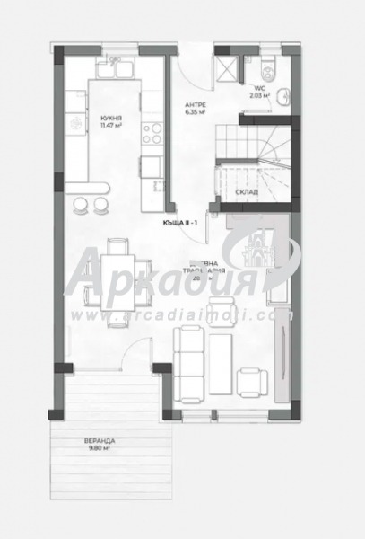 ЕТАЖ I - дневна с кухня, санитарен възел, дворна веранда;