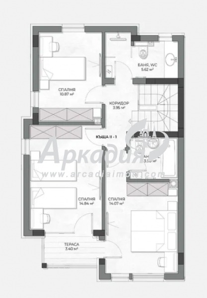 ЕТАЖ II - 3 спални с два санитарни възела, антре и тераса.