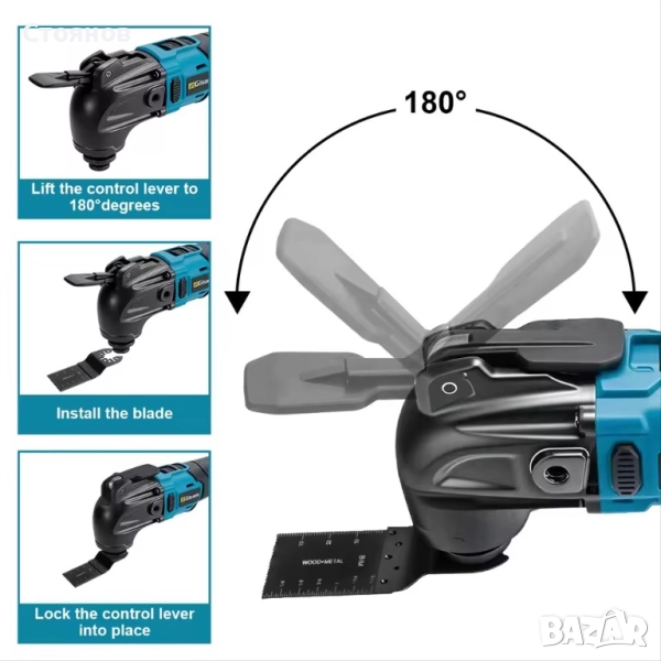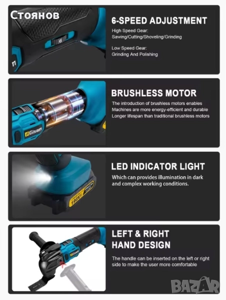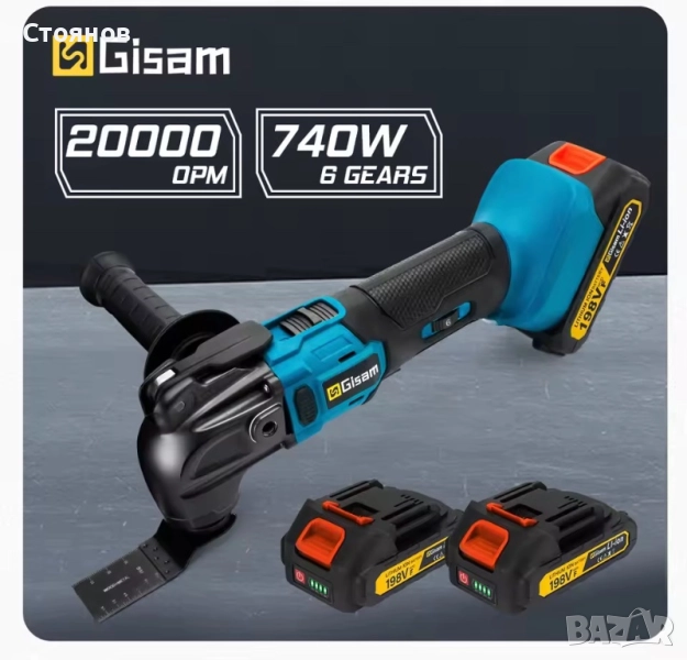 За София е възможно лично предаване. Многофункционален осцилиращ инструмент с безчетков мотор - което означава много по дълъг живот и експлоатационен период, цената включва освен инструмента и два броя мощни батерии 20 волта 6 амперчаса, двуреводи, икономична работа и тих режим, регулиране на оборотите.