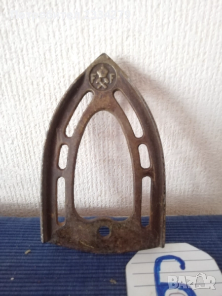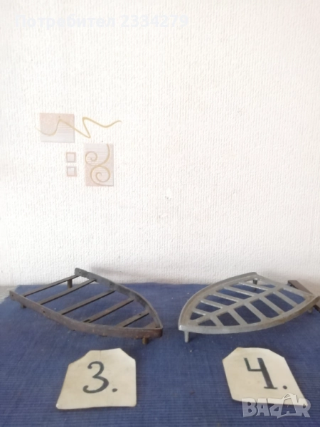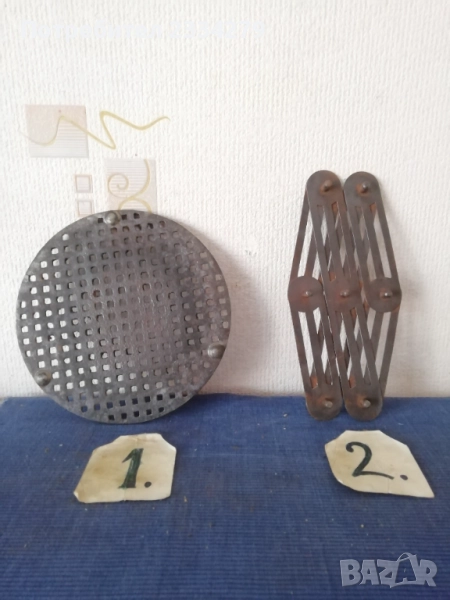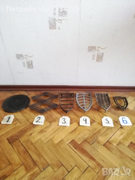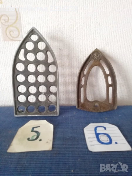 ютия от 40-те години, размери 23х11см.,цена 15лв.; N:4,5 стари аломиниев подложки от 60-70те години, цена 15лв. за бройка; N:6 стара немска подложка с кралска корона, инициали и емблема на производителя, изработена в работилниците на Солинген, 1874год., размери 16х10см. рядко срещана уникална, цена 35лв.