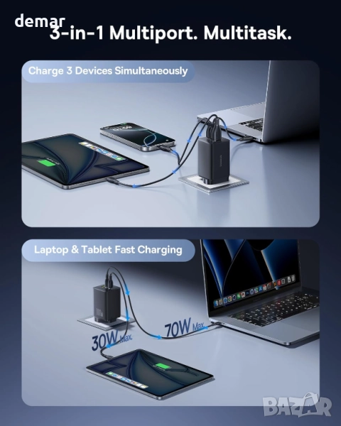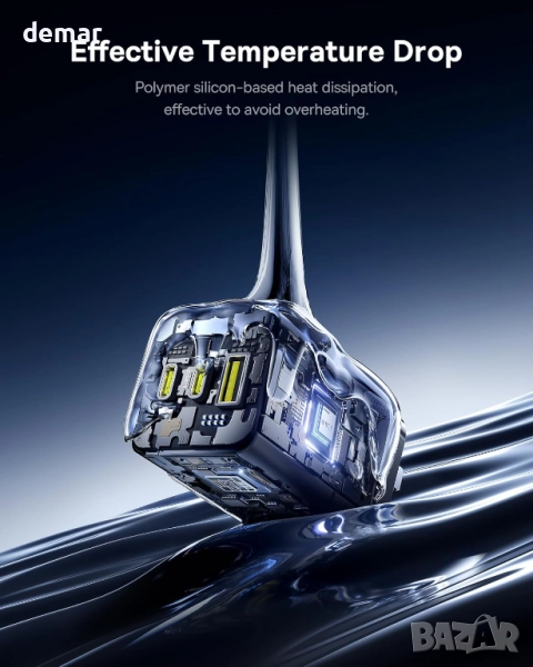 Компактно 100W бързо зарядно устройство с два USB-C и един USB-A порт, способно да зарежда до три устройства едновременно, използвайки интелигентно разпределение на мощността за оптимална ефективност. Изработено с усъвършенстван високополимерен силиций и технология за охлаждане, за да поддържа ниска температура по време на употреба, осигурявайки безопасност и защита на батерията. Поддържа множество протоколи за бързо зареждане, включително PD3.0, QC3.0 и PPS, което го прави подходящо за широка гама от устройства - от лаптопи до смартфони. Малкият му, удобен за пътуване дизайн спестява място и е идеален за употреба у дома, в офиса или в движение.