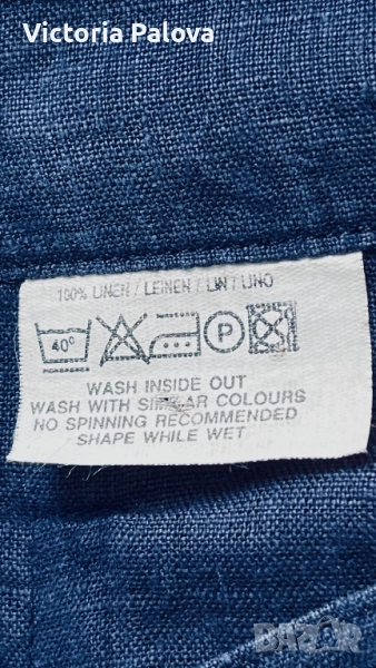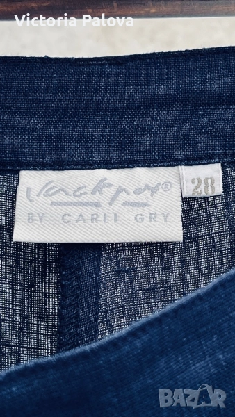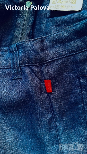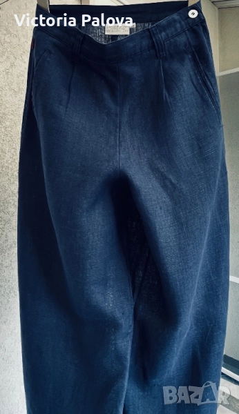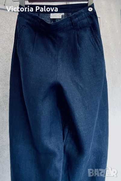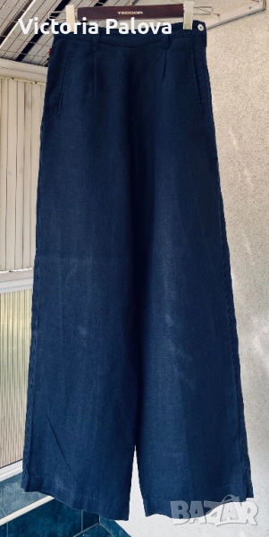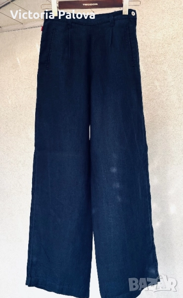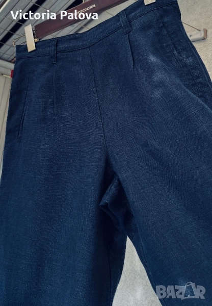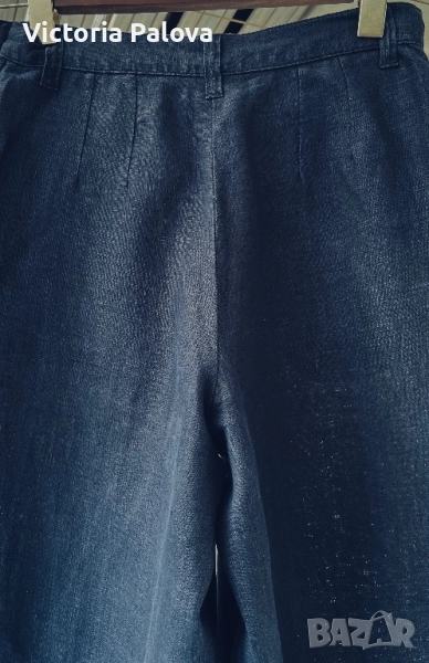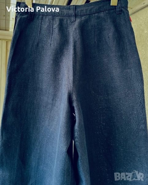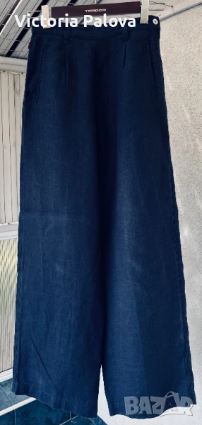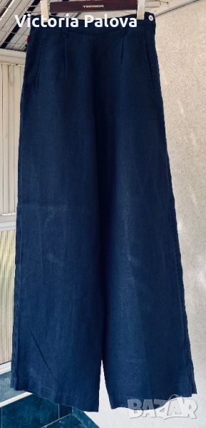 Широка кройка с висока талия и супер красиви стилни джобове - 100% лен , дишащ, тежък и много елегантен - лукс от датската мода. Перфектен wide-leg панталон за офисен блясък или уикенд приключения, комбиниращ елегантност и комфорт. Талия - 36см, дължина - 101см, крачол отвътре - 76см, широчината му - 33см горе и 26см долу, страничен цип.