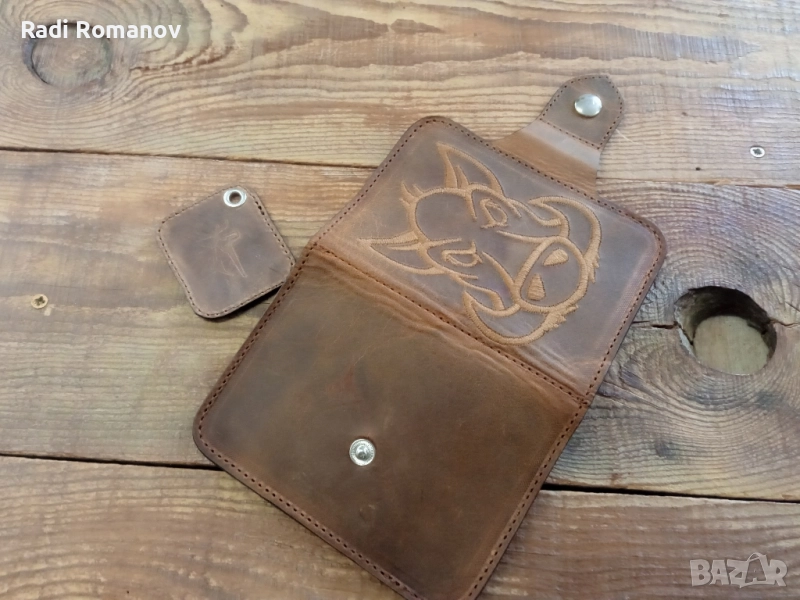 Кожен джобен портфейл, за карти лични, ловни , риболовни документи, свити банкноти и т.н със стилизирана ловна бродерия.