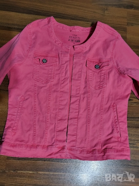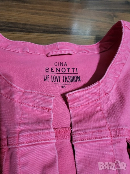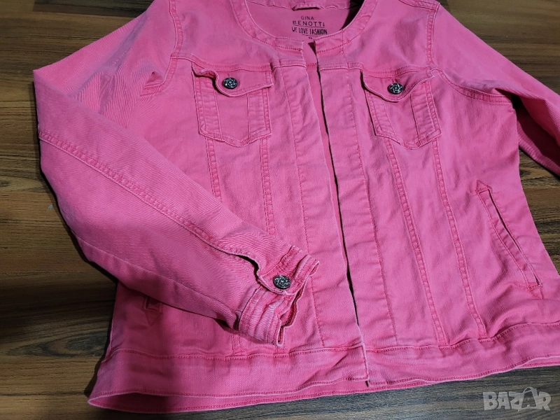 Предлам дънково яке GINA BENOTTI в сладък розов цвят. Размера е 46, за ГО до 112 см. Ханш 104см, дължина 59 см, рамене 46 см, дължина ръкав 64см.
