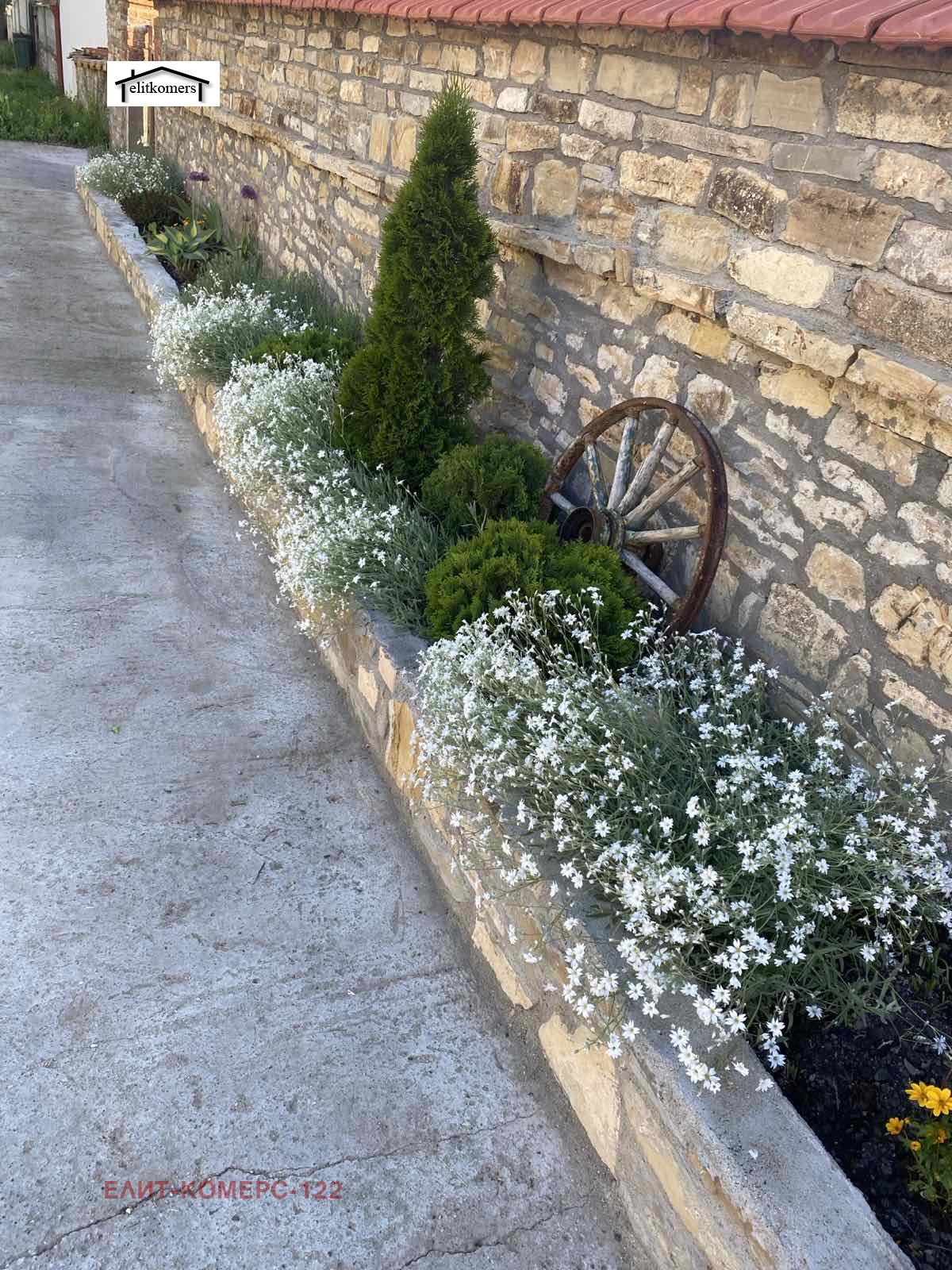 Имотът е обграден почти напълно с каменни дувари а входът го краси огромна дървена порта. По протежение на целия дувар към улицата е изграден каменен цветарник, който е пълен с цветя. Към градината има метални врати с възможност за влизане на селскостопанска техника. Пред къщата е оформен плочник и цветна градина с над 3000 пролетни цветя(лалета, зюмбюли, нарциси, минзухари, кокичета), както и над 500 рози, които се поливат чрез капково напояване с електронно управление.