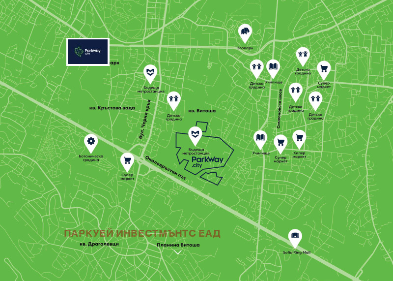 Разположен в престижна локация, ParkWay.city съчетава модерния дизайн и съвременните технологии с дълбоко разбиране за човешките потребности. Това не е просто нов жилищен проект това е пространство, което дава нов смисъл на думата среда . Това е проект, който мисли за всеки детайл от инфраструктурата до обществените пространства, от алеите до парковете и детските площадки, от канализацията, водопроводите, осветлението, улиците, паркоместата до зелените площи. ParkWay.city е място, където не само се изграждат жилищни и търговски обекти, но и истинска инфраструктурна екосистема, която да бъде еталон за устойчиво градско развитие.