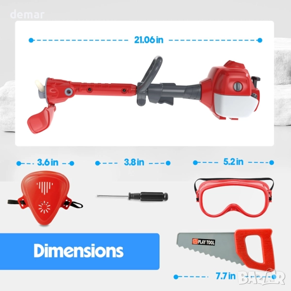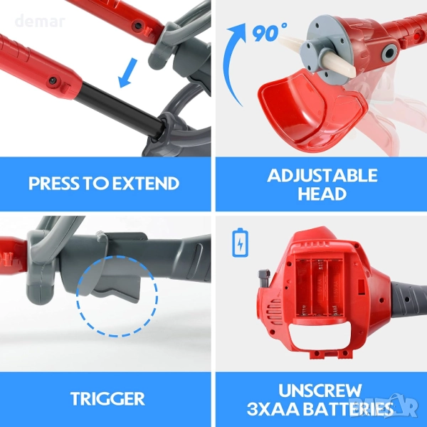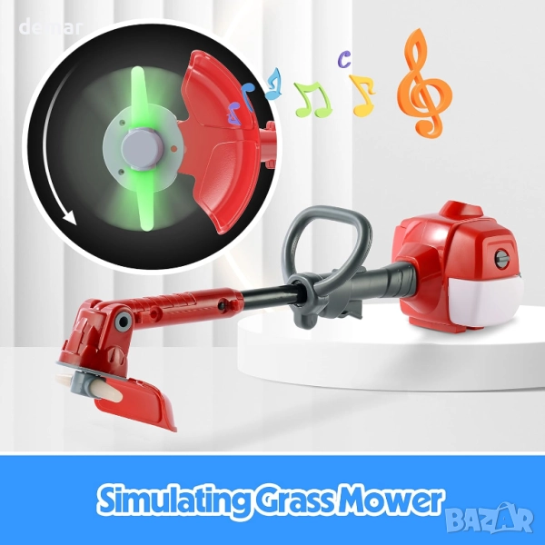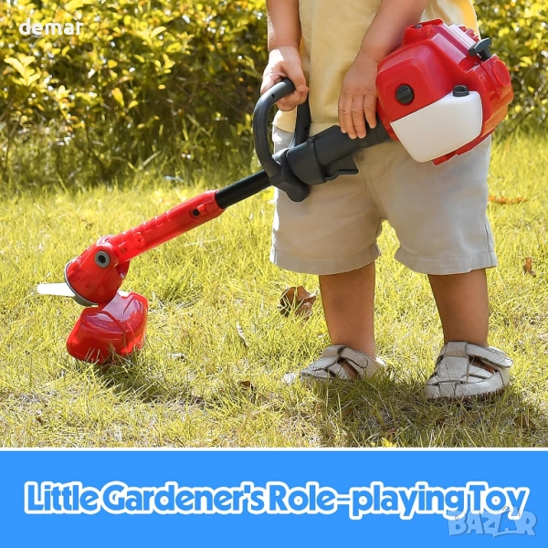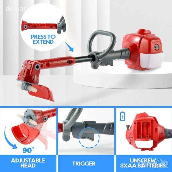 Тази играчка-тример за градина имитира истински тример с реалистични звуци и светеща зелена LED светлина, насърчавайки въображаемата игра. Разполага с безопасна, екологична TPR гумена глава, която е издръжлива и устойчива на износване. Регулируемата глава може да се завърта на 90 градуса, а телескопичната дръжка се разтяга за по-гъвкава употреба. Включени са забавни аксесоари като очила, трион и маска, които подобряват играта и подобряват координацията и уменията за наблюдение. Необходими са три AA батерии, които не са включени.