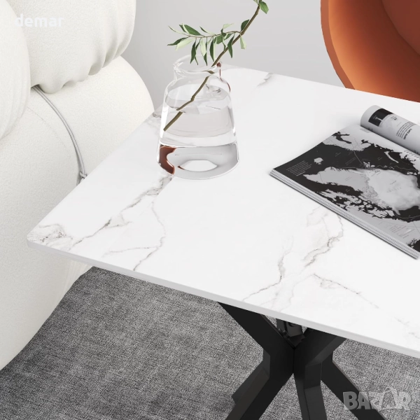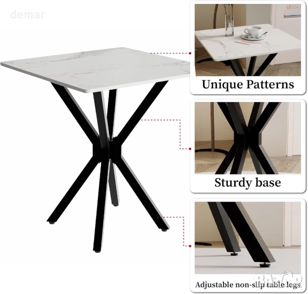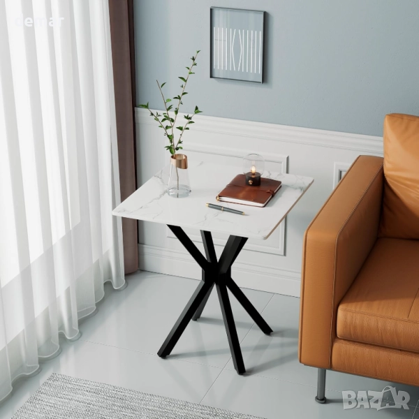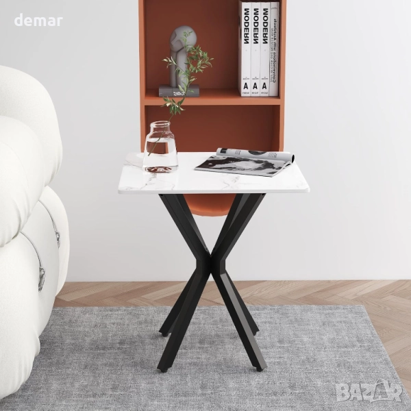 Компактна странична маса с размери 50×50×55 см, с издръжлив мраморен плот, който е гладък, твърд и лесен за поддръжка. Черните метални крака с прахово покритие осигуряват стабилна конструкция и са устойчиви на корозия за дълготрайна употреба. Елегантният мраморен мотив и централният дизайн на краката подобряват баланса и визуалната привлекателност, предотвратявайки клатушкането. Подходяща за различни пространства, като хол, спалня или офис, тя служи добре като странична маса за кафе или чай, декор или ежедневни предмети. Предлага се с всички необходими части и ясни инструкции за бърз и безпроблемен монтаж.