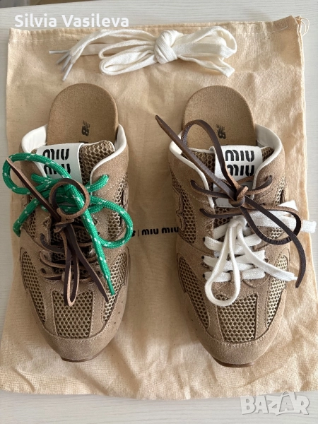 Нови дамски обувки колаборация New Balance x Miu Miu модел 530 SL без пета/сабо. Бежов цвят с цветни връзки. Допълнителни връзки в бяло към обувките + противопрахова торбичка. Размер 39 , продават се без оригиналната кутия. Чисто нови закупени от Mytheresa. Лимитиран модел.