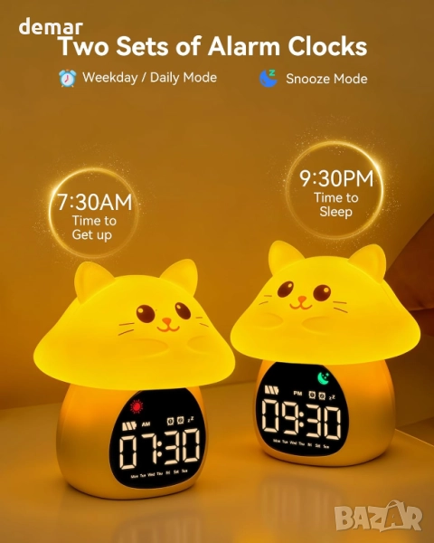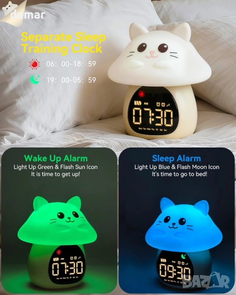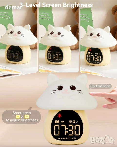 Yiliaw Будилник за сън с нощна RGB светлина за деца, 6 алармени тона и бял шум, коте