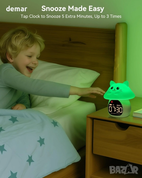 Този часовник за сън помага на децата да развият здравословни навици за сън с нежни светлинни сигнали, които сигнализират за време за лягане и събуждане. Той разполага с двойна аларма с настройки за делнични дни и цяла седмица, плюс 5-минутно дрямка за допълнителна почивка. Устройството функционира и като нощна светлина и RGB лампа, предлагайки множество режими на цвят и яркост за комфорт и забавление. Родителите могат да избират от шест тона на аларма, опции за бял шум и регулируеми нива на силата на звука, за да отговарят на различните спящи. Изграден с акумулаторна батерия, персонализируема яркост на екрана и безопасен, издръжлив дизайн, той е практичен, подходящ за деца и лесен за употреба. Проектиран като надежден детски будилник, той се предлага с акумулаторна батерия 2000mAh, 3 нива на яркост на екрана и превключващ 12/24-часов формат. Изработен от безопасен за деца ABS + мек силикон, гарантиращ издръжливост и безопасност в детските спални.
