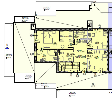 Разпределение: 1-во ниво: хол с трапезария и кухн. бокс-37 кв.м, баня с тоалетна-2,5 кв.м, балкон-12 кв.м; 2-ро ниво: спалня с дрешник-17 кв.м, спалня-15 кв.м, спалня-9 кв.м, две бани с тоалетни, обиколна тераса-90 кв.м