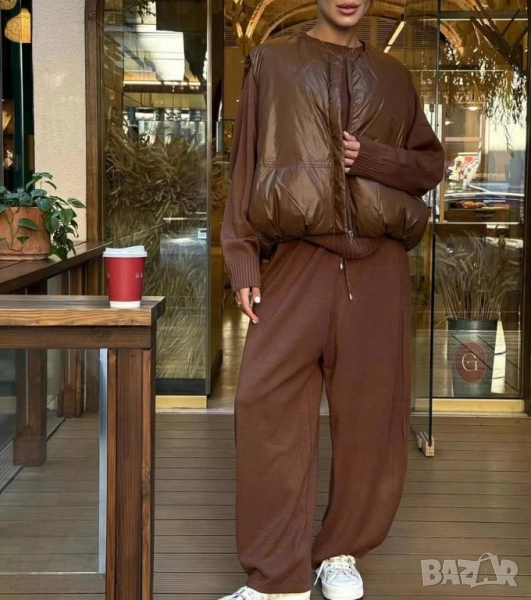 Комплект три части Екип машинно плетиво baggy fit Елек със силиконова вата Стандарт ( машинното плетиво е много еластично, елека е със свободна кройка). Комплекта е подходящ за дама от М до ХЛ 120лв