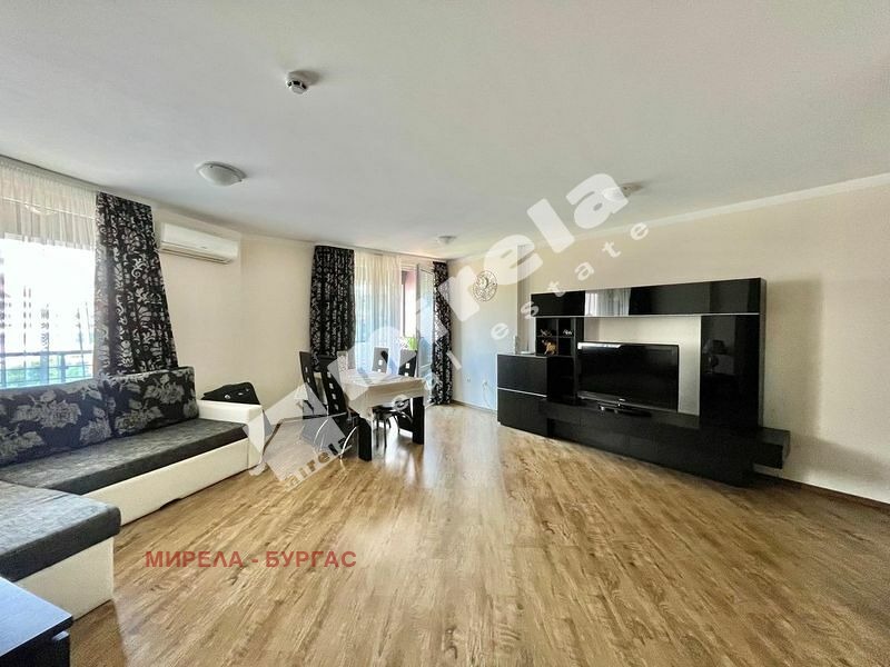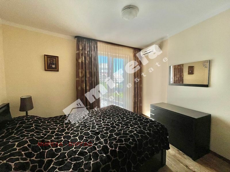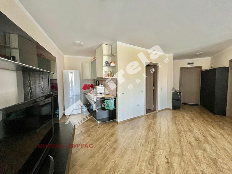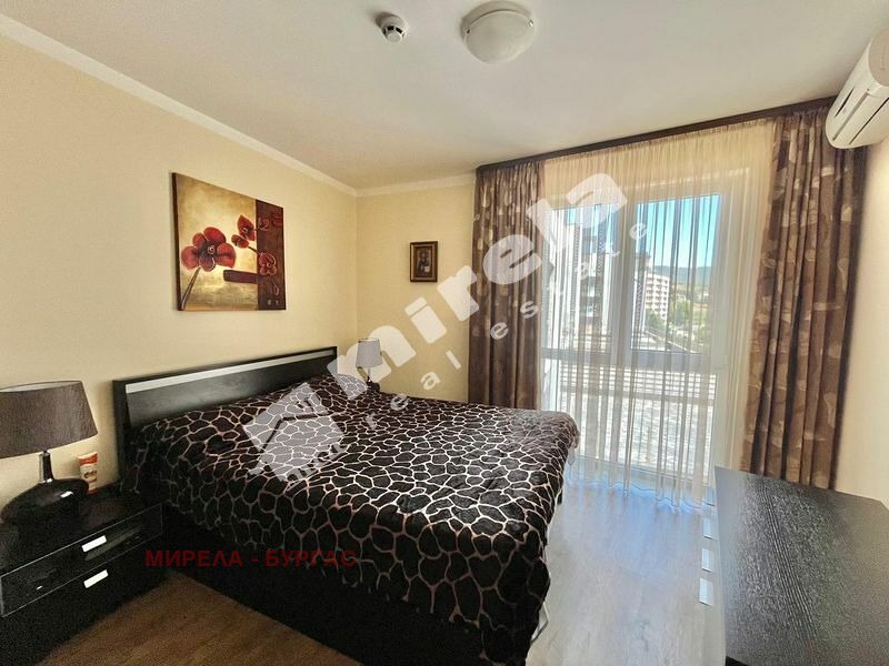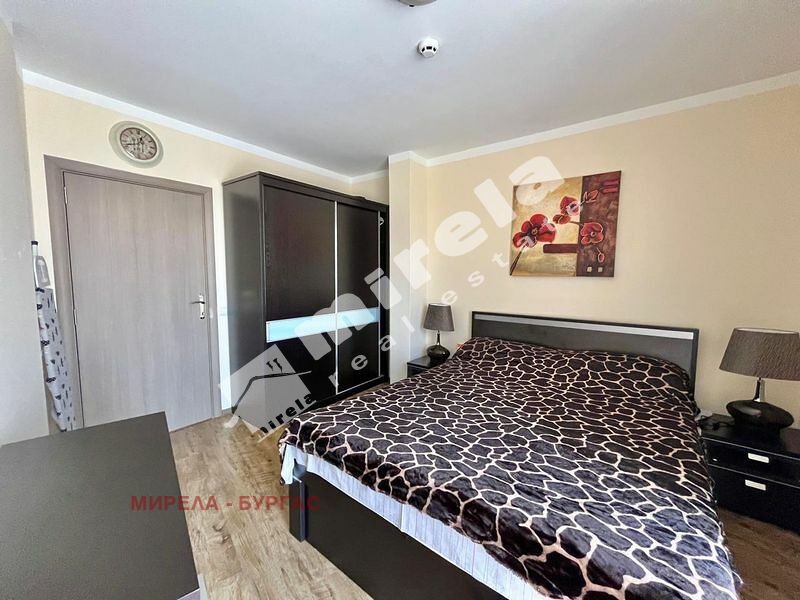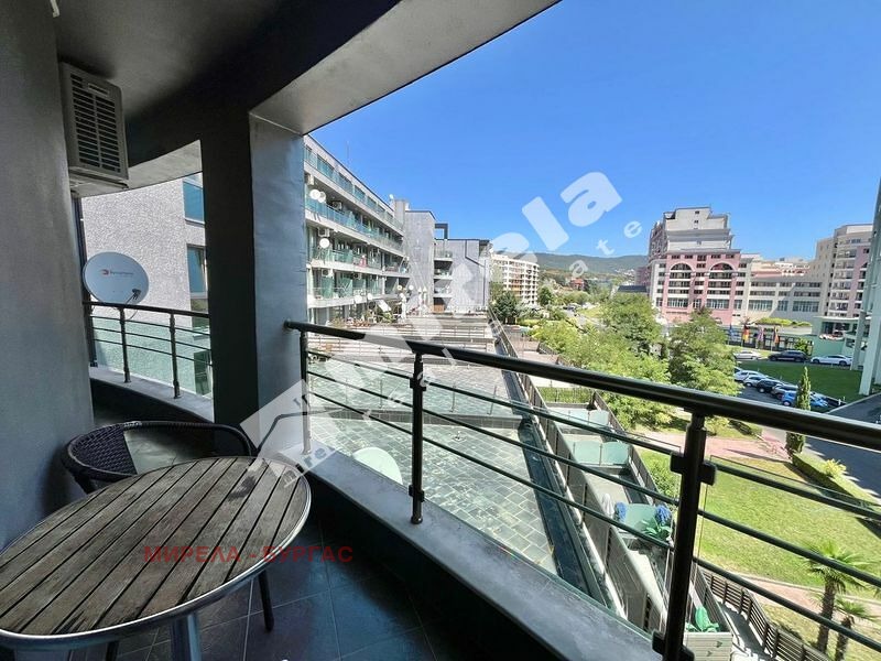 Апартаментът е със следното разпределение -малко антре от което се влиза направо във всекидневната и има врата към спалнята. Имотът има един санитарен възел и една тераса с гледка към басейна. Комплексът се намира на метри от морския бряг в един от най-тихите и красиви райони на северната част на Слънчев бряг. В непосредствена близост са голям супермаркет, спирка на градския транспорт, аптека. Акт 16, такса поддръжка 991евро на година/82,58евро на месец/.