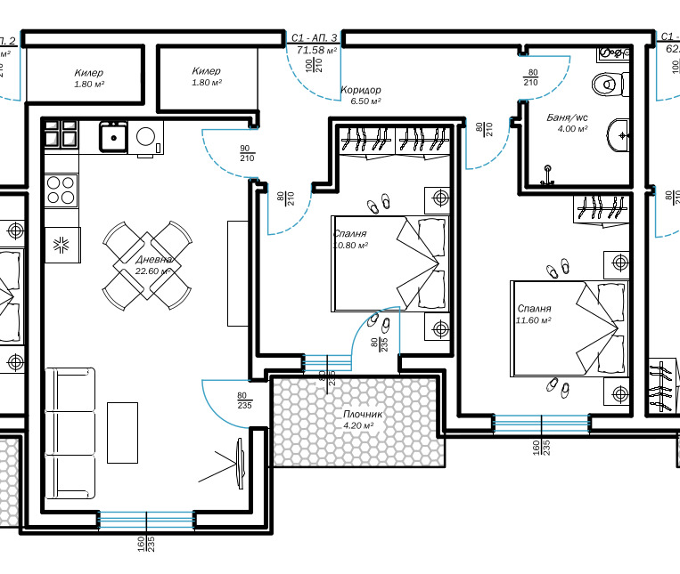 Разпределение: дневна с кухненски бокс, две спални, баня с тоалетна (или две санитарни помещения според разпределението), коридор и тераса/тераси.