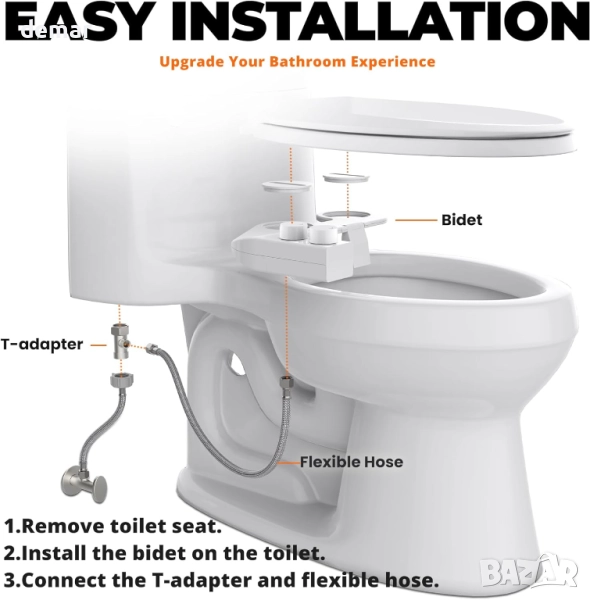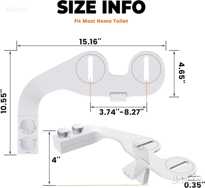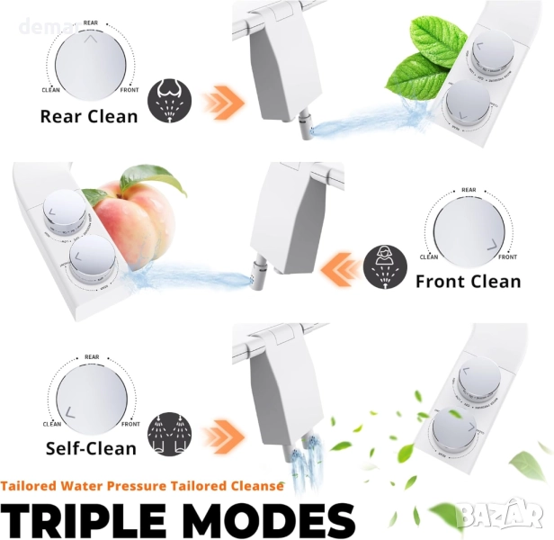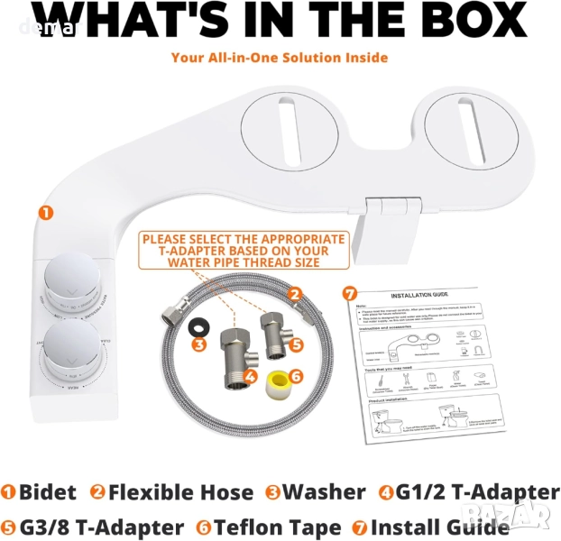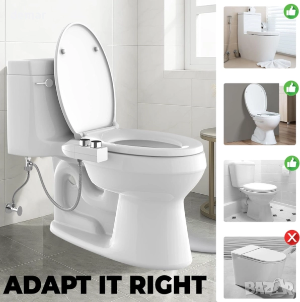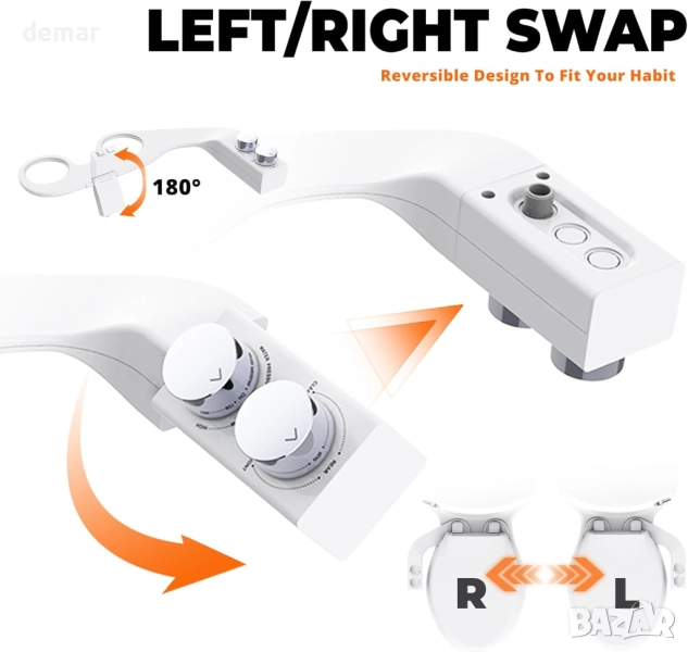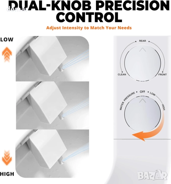 Лесен монтаж с два месингови Т-образни адаптера, съвместими с ВиК, без нужда от водопроводчик. Предлага обратимо управление за употреба от лявата или дясната ръка и двойни самопочистващи се дюзи с регулиране на 180° както за задно, така и за женско измиване. Работи изцяло с водно налягане с регулируем поток от нежен до силен, което го прави подходящ за чувствителна кожа. Тънкият му, пестящ място дизайн се побира идеално под повечето тоалетни чинии, без да влияе на комфорта, а ергономичното оформление осигурява удобна и хигиенична ежедневна употреба.
