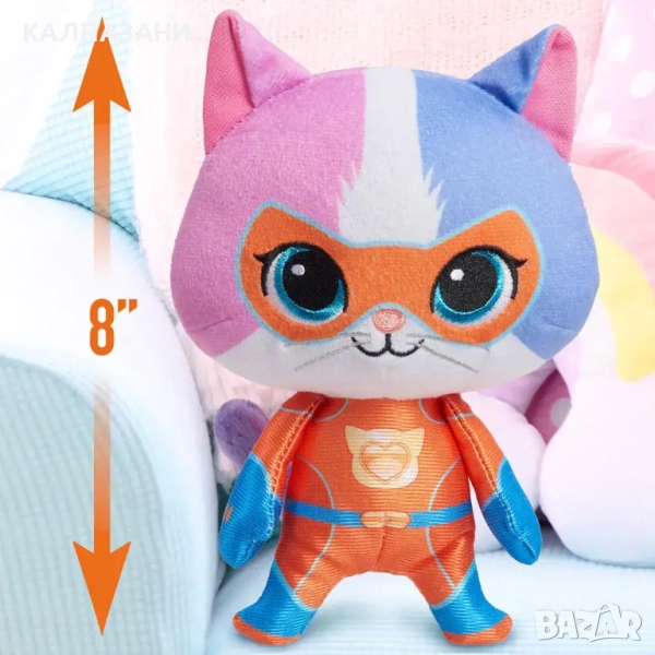 От мустачките до опашките, плюшените котета на Disney Junior SuperKitties са супер очарователни! Вдъхновени от анимационния сериал на Disney Junior, всяко плюшено коте SuperKitties се отличава с ярките цветове на техния костюм на супергерой и невероятни детайли, които вдъхват живот на героя. Тези безстрашни котета са готови за приключения като игра в Китидейл и извън него. Изработени от супер мек плюш, плюшени играчки са идеални за гушкане по време на дрямка, време за приказки, или за игра. С размери от 16 до 20 см. височина, всяко пухкаво коте е чудесен спътник за всеки фен. Асортиментът включва плюшени котета Buddy и Sparks (всяко се продава отделно).