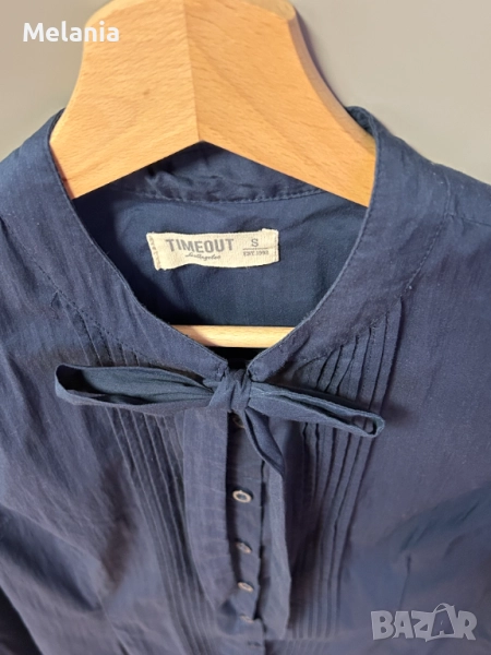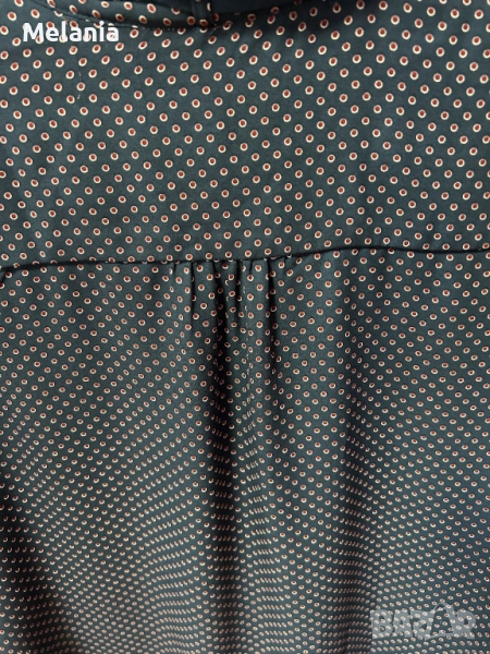 Promod – Тъмносиня основа с фин геометричен десен и нежна панделка на яката. Леко удължена кройка, приятна материя. ПРОДАДЕНА!