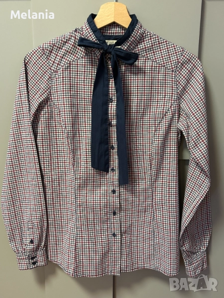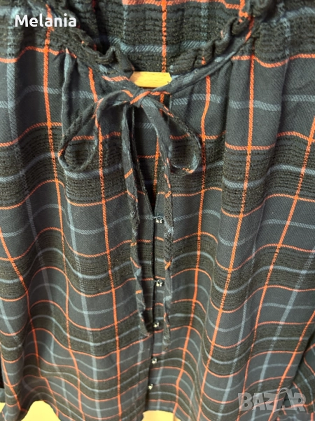 Tom Tailor – Мека, удобна блуза с дълъг ръкав и връзки на деколтето. Тъмносиня основа с червено каре.