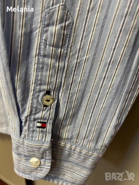 Tommy Hilfiger – Елегантна синьо-бяла риза с деликатни волани и класическа ивица. Маншети в контрастно райе, висококачествен памук.