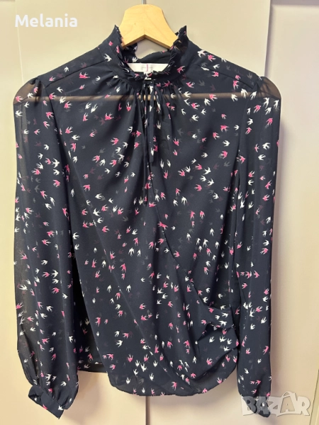 Jasper Conran – Елегантна риза с изискан силует и връзка на врата. Висока яка, маншети с облечени копчета, тъмносин фон с принт от розови и бели лястовички.